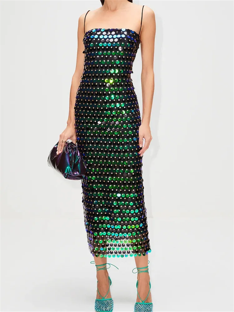 Women Sequins Midi Dress Spaghetti Strap