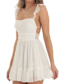 Women Summer Casual Mini Dress Swiss Dot Fly Sleeve Tie-Up Backless Dress Beach Holiday Party Short Dress